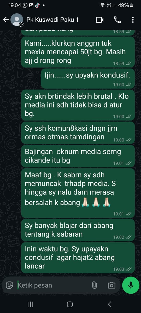 “Kami… keluarkan anggaran untuk media mencapai 50 juta bang, masih aja dirongrong,” tulis BHR dalam pesan yang tersebar.