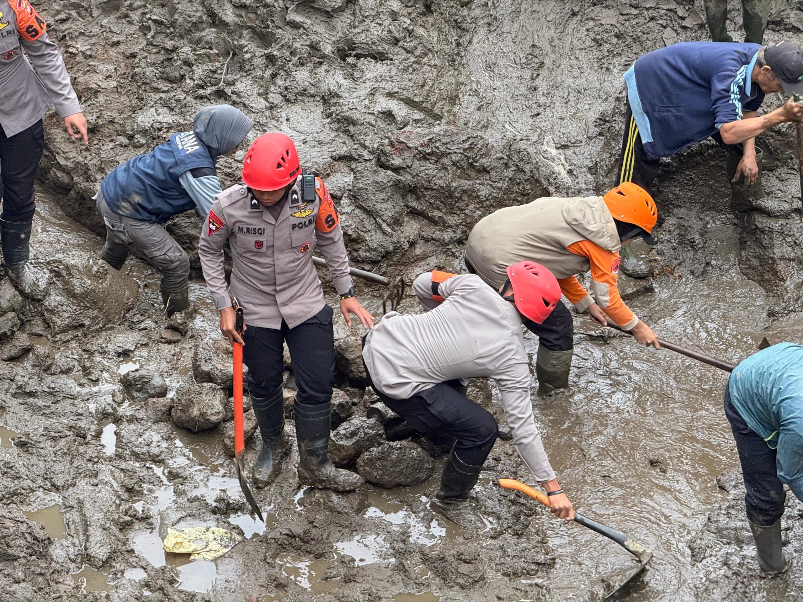 Proses evakuasi dilakukan secara manual di tengah kondisi medan yang berat, berlumpur, dan penuh dengan puing-puing kayu dan material longsoran.