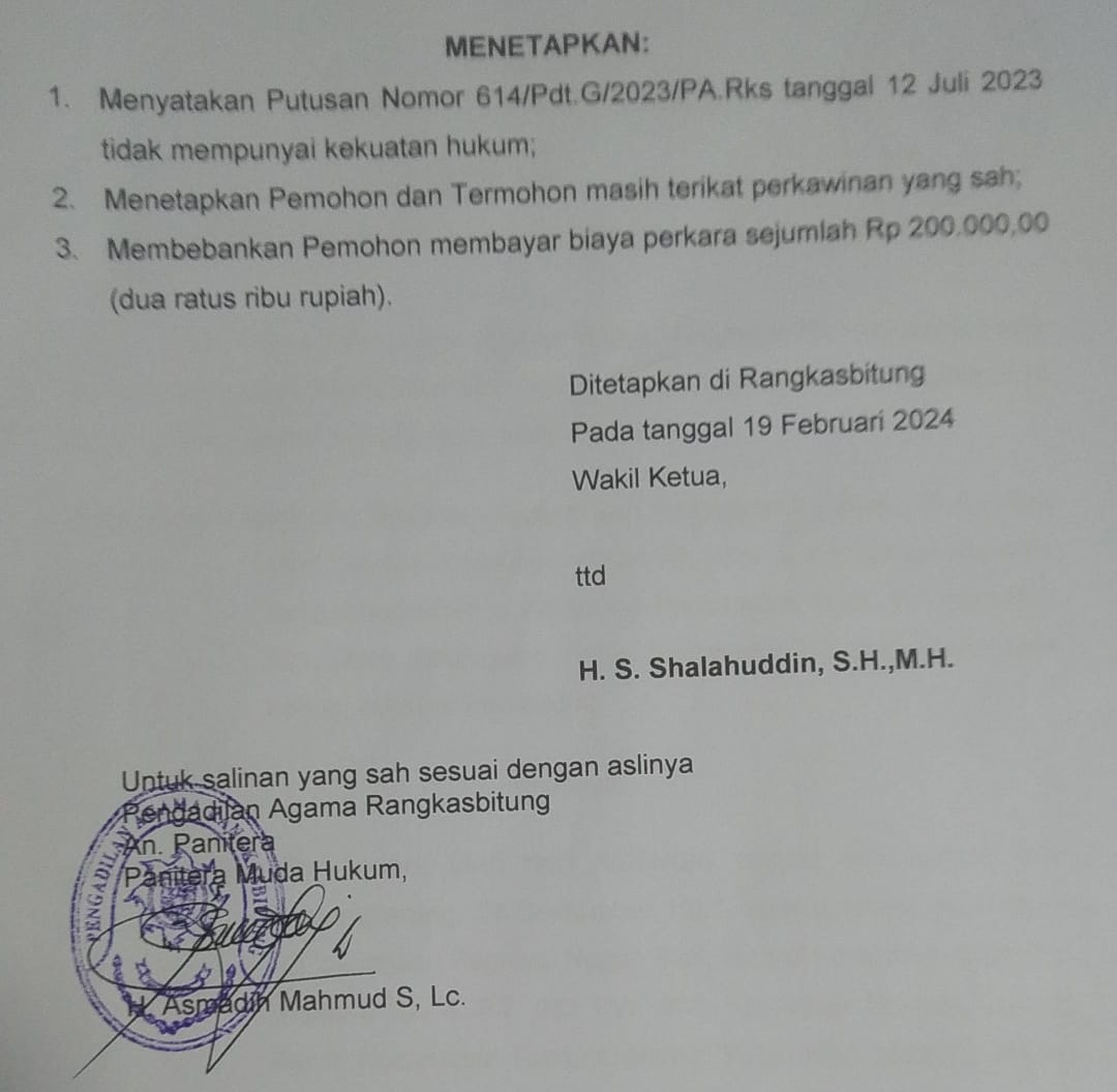 1. Menyatakan Putusan Nomor 614/Pdt.G/2023/PA.Rks, tanggal 12 Juli 2023 tidak mempunyai kekuatan hukum,