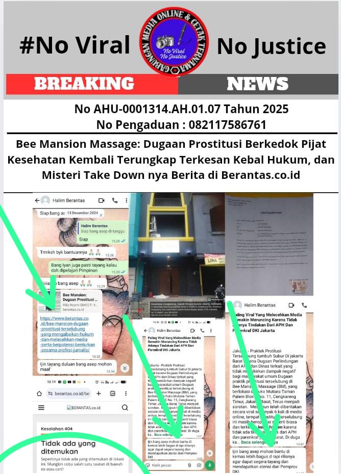 Eksposelensa.com – Jakarta, 21 Mei 2025 (GMOCT) – Gabungan Media Online dan Cetak Ternama (GMOCT), yang beranggotakan puluhan media online dan cetak ternama, kembali menyoroti dugaan praktik prostitusi di Bee Mansion Massage, Jakarta Barat. Ini merupakan pemberitaan keempat kalinya terkait Bee Mansion sejak November 2024, menunjukkan adanya dugaan praktik yang terus berlangsung. Menariknya, Berantas.co.id, salah satu media online yang sebelumnya aktif memberitakan kasus ini dan yang memberikan informasi dan data kepada GMOCT serta sempat tergabung dalam GMOCT, kini diduga telah “damai” dengan Bee Mansion dan menghapus pemberitaan terkait.