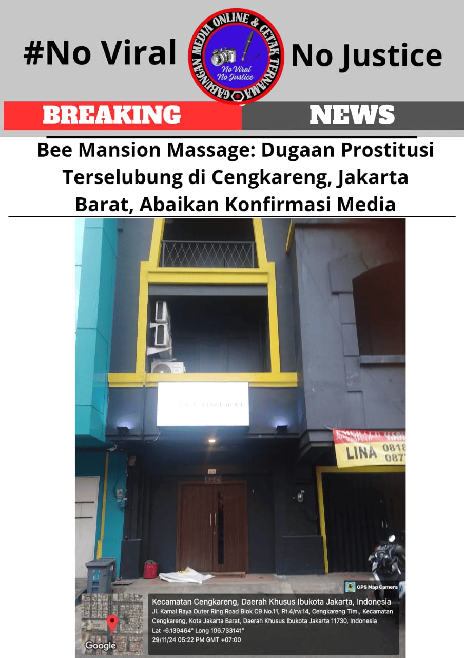 Eksposelensa.com – Jakarta, 30 November 2024 – Dugaan praktik prostitusi terselubung kembali terendus di wilayah Jakarta Barat, tepatnya di Bee Mansion Massage yang berlokasi di Ruko Mutiara Taman Palem Blok C no 11, Cengkareng Timur. Tempat pijat ini diduga kuat menjalankan praktik prostitusi terselubung dengan menawarkan layanan pijat plus-plus yang lebih murah dibandingkan lokasi serupa di Taman Palem.