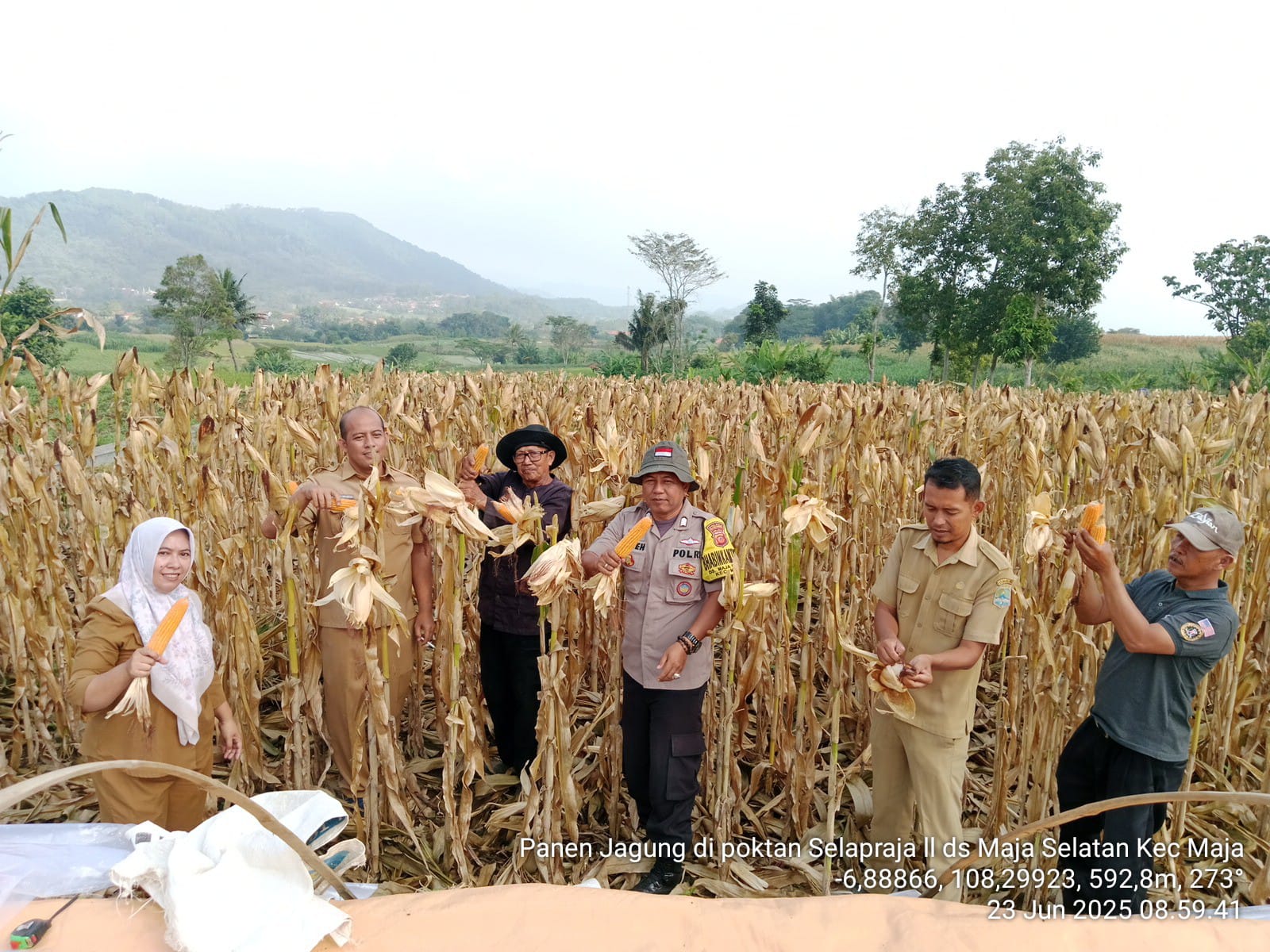 Eksposelensa.com – Majalengka – Bripka Soleh, Bhabinkamtibmas Desa Maja Selatan, Polsek Maja, Polres Majalengka, bersama Balai Penyuluhan Pertanian dan Kelompok Tani Selapraja 2, sukses menggelar panen raya jagung seluas 1 hektar pada Senin, (23/06/2025).