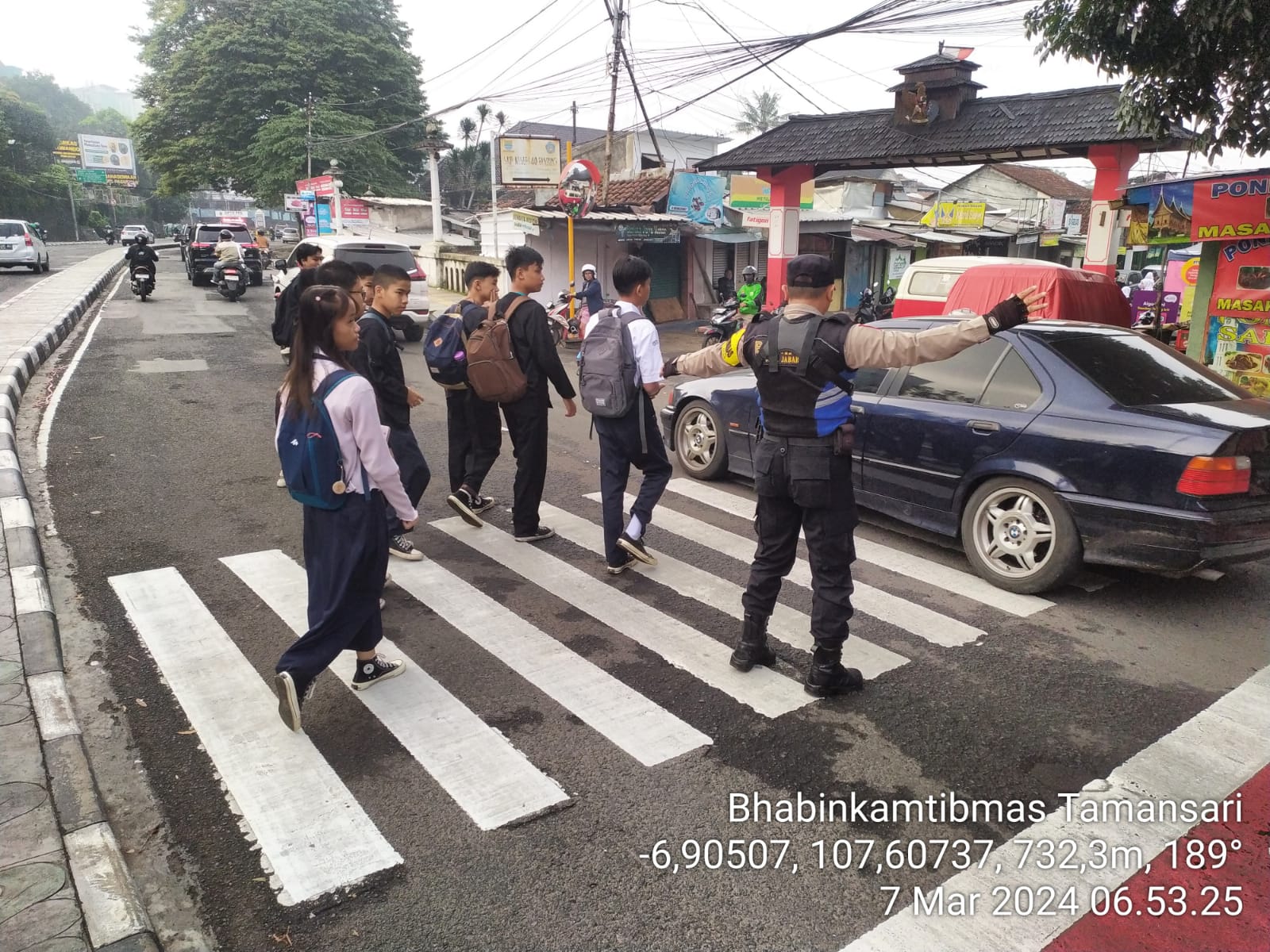 Eksposelensa.com  | Polrestabes Bandung Polda Jabar-polsek Bandung wetan,personil Bhabinkamtibmas Polsek Bandung wetan kelurahan Tamansari AIPDA Deni Novriatna lakukan Pengaturan pagi dan penyebrangan anak Sekolah di Zona Sekolah bertempat di depan Sekolah SMP N 40 Bandung Jl. Wastukencana Kota Bandung