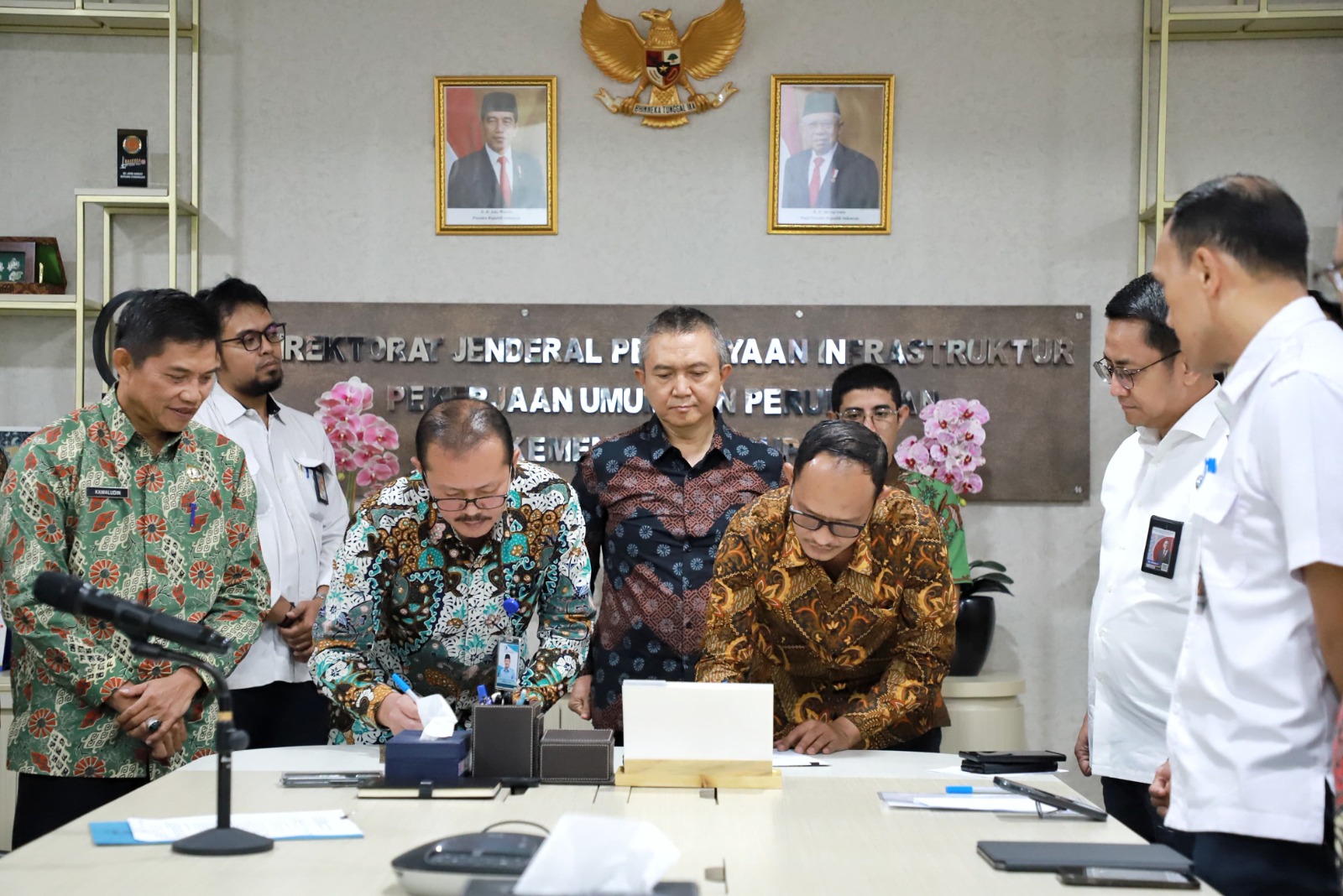 Eksposelensa.com | Bupati Bandung Dadang Supriatna turut menyaksikan penandatanganan perjanjian kerja sama investasi antara Perumda Air Minum Tirta Raharja dengan PT Moya Indonesia dan PT Air Bandung Timur, di Kantor DJPI Kementerian PUPR Jakarta. Kamis (18/7/2024).