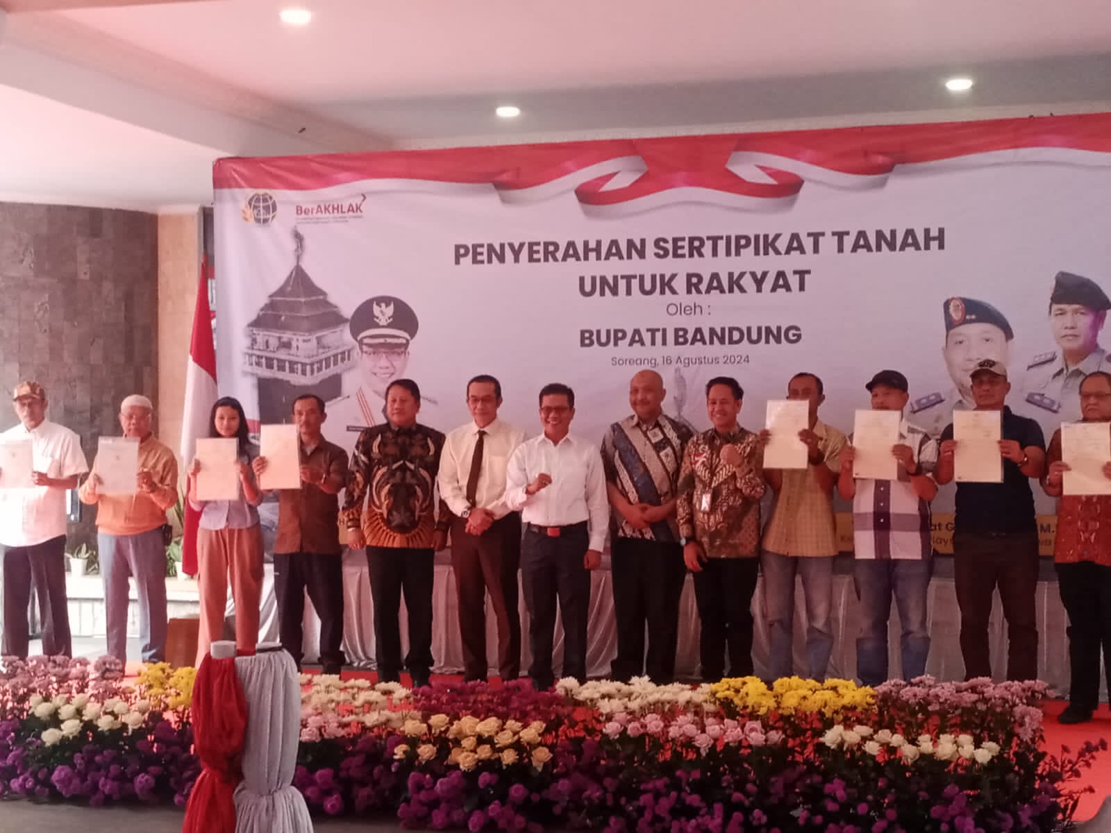 Tantangan dari Kakanwil BPN kepada Bupati Dadang Supriatna disampaikan saat Yuniar berikan sambutan di acara penyerahan sertifikat Pendaftaran Tanah Sistematis Lengkap (PTSL) bagi masyarakat Desa Cibodas Kecamatan Solokanjeruk. Bertempat di Kantor BPN Soreang, Jum’at pagi 16/8/2024.