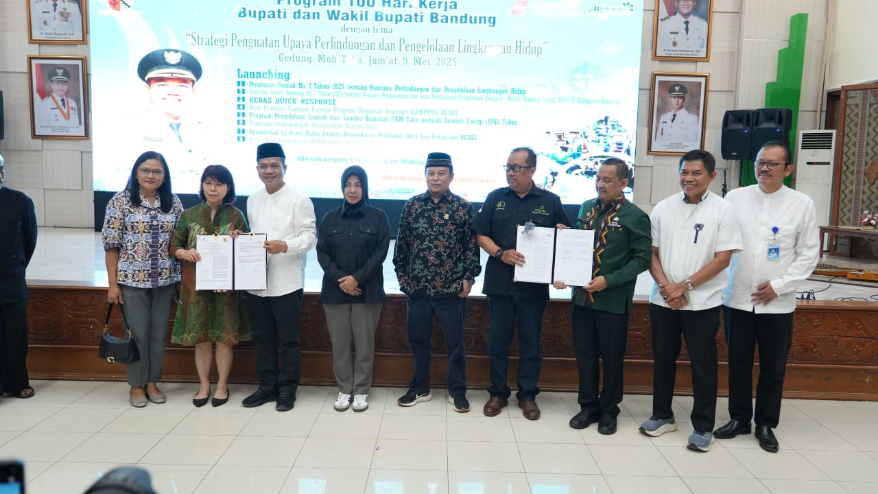 Pertama, launching Peraturan Daerah No 2 tahun 2025 tentang Perlindungan dan Pengelolaan Lingkungan Hidup. Kedua, launching Instruksi Bupati Bandung No 5 tahun 2025 tentang Gerakan Pengurangan dan atau Pembatasan Pengurangan Kemasan/Wadah/Kantong Sekali Pakai di Kabupaten Bandung.