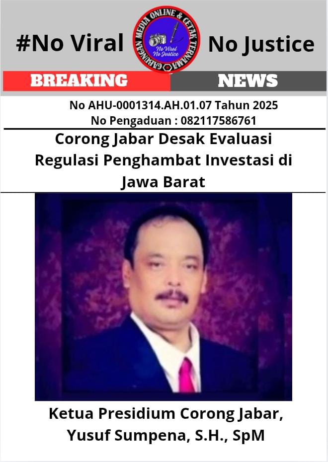 Eksposelensa.com -BANDUNG (GMOCT) – Ketua Presidium Corong Jabar, Yusuf Sumpena, S.H., SpM (Kang Iyus), mendesak pemerintah pusat dan daerah untuk segera mengevaluasi regulasi yang dinilai menghambat investasi di Jawa Barat.  Informasi ini didapatkan GMOCT (Gabungan Media Online dan Cetak Ternama) dari media online Aswajanews.