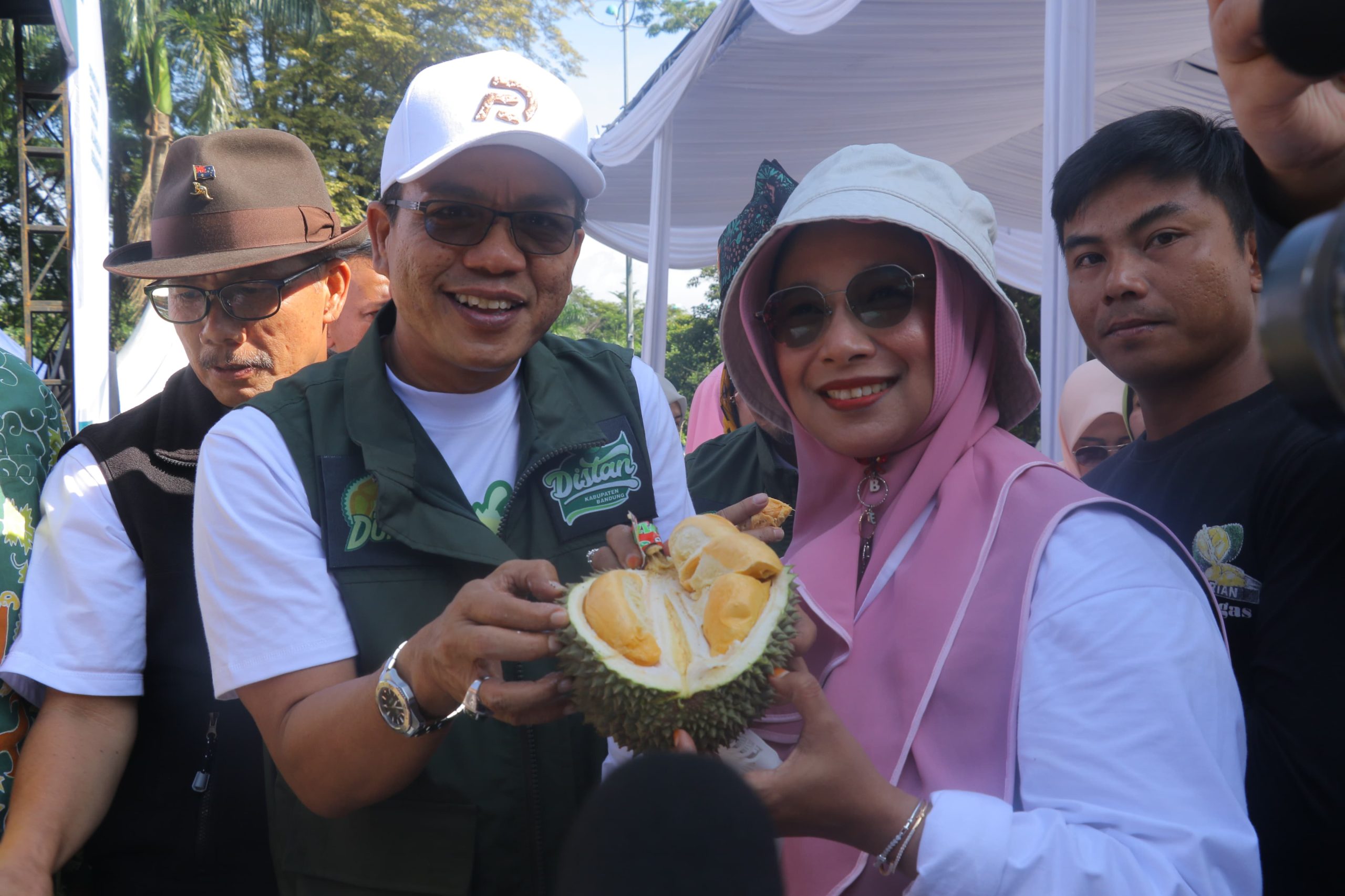 Bupati Bandung Dadang Supriatna didampingi Bunda Bedas Emma Dety Dadang Supriatna dan Kepala Dinas Pertanian Kabupaten Bandung Ningning Hendasah hadir langsung pada giat Bedas Festival Durian tersebut.