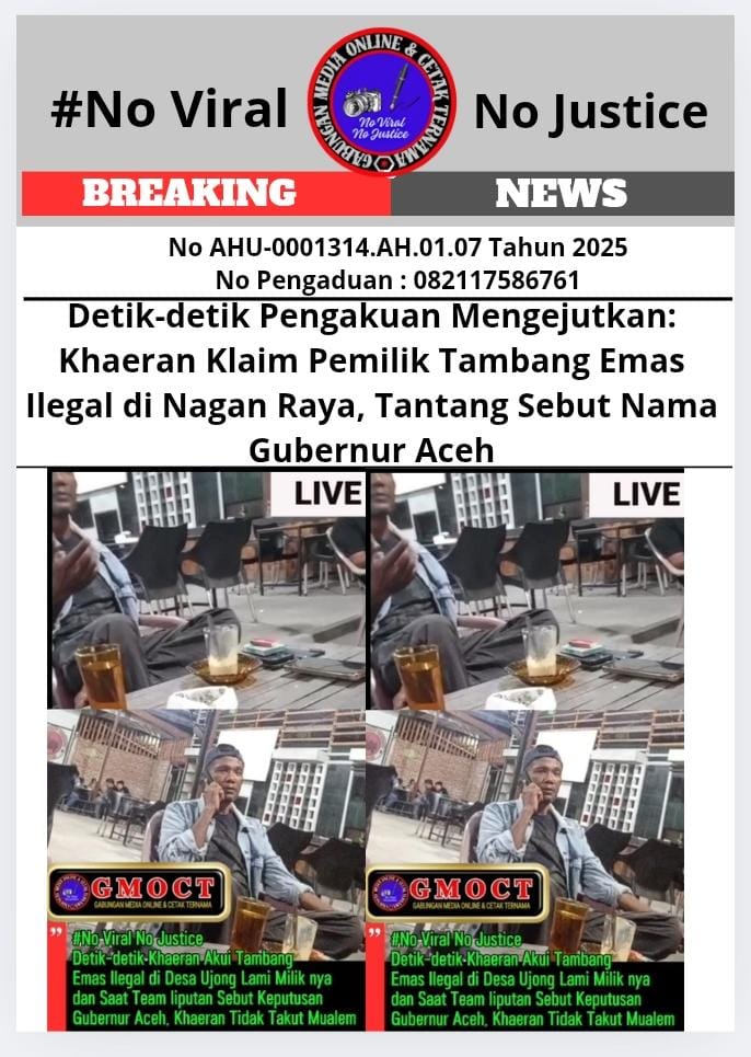 Eksposelensa.com – Meulaboh, Aceh (GMOCT) – Sebuah video pengakuan yang menghebohkan muncul dari seorang pria bernama Khaeran, yang secara terbuka mengaku sebagai pemilik tambang emas ilegal di Desa Ujong Lami, Kecamatan Darul Makmur, Kabupaten Nagan Raya, Provinsi Aceh. Pengakuan ini terungkap dalam pertemuan antara Khaeran dan tim liputan khusus GMOCT (Gabungan Media Online dan Cetak Ternama) di sebuah kafe di Meulaboh 12 Oktober 2025 sekitar pukul 23.06 WIB.