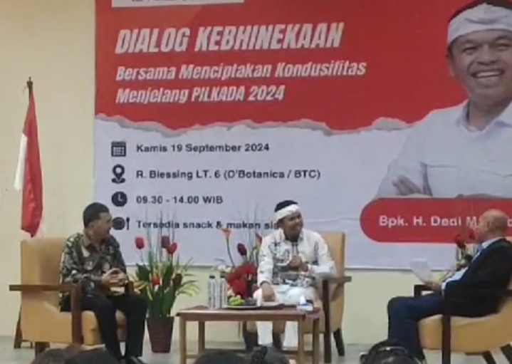 Eksposelensa.com | Bandung, – Ketua Rumah Bersama Rakyat Jawa Barat Ir. H. Deden Hidayat yang biasa dipanggil Wa Deden, Hadiri acara Dialog Kebhinekaan bersama menciptakan kondusifitas menjelang Pilkada 2024. Yang bertempat di Gedung BTC, Kota Bandung, Kamis 19 September 2024.