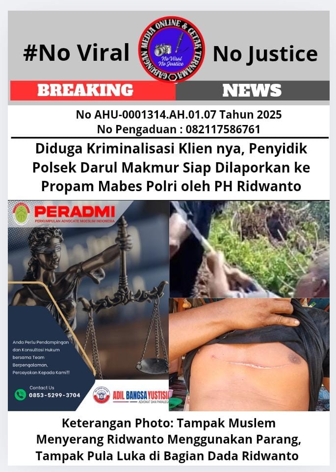 Tri Agus Wantoro, SH, dari Kantor Hukum Adil Bangsa Yustisia, menyatakan bahwa perkara yang menimpa kliennya diduga kuat merupakan bentuk kriminalisasi yang dilakukan oleh penyidik Polsek Darul Makmur.