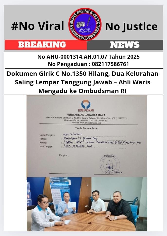 Eksposelensa.com – Bekasi (GMOCT) – Kasus hilangnya dokumen tanah Girik C No.1350 atas nama Almarhum Aliyas Bin Aing memasuki babak baru. Kuasa ahli waris, H.M. Sulaeman, dengan didampingi pimpinan media dari SBI dan Bhayangkara News, secara resmi melaporkan dugaan maladministrasi ini ke Ombudsman Republik Indonesia (RI), Senin (13/10/2025).