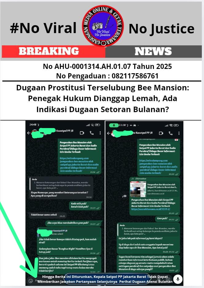 Sorotan publik kini tertuju pada Pemprov DKI Jakarta, Satpol PP, dan pihak terkait. Masyarakat menuntut tindakan nyata yang transparan dan tuntas, bukan hanya inspeksi dadakan. Pertanyaan besar pun muncul: apakah Pemprov DKI memiliki keberanian untuk membersihkan Ibu Kota dari praktik haram yang diduga terjadi di Bee Mansion? Sayangnya, hingga saat ini, pejabat Dinas dan Suku Dinas Pariwisata dan Ekonomi Kreatif DKI Jakarta masih bungkam saat dikonfirmasi.