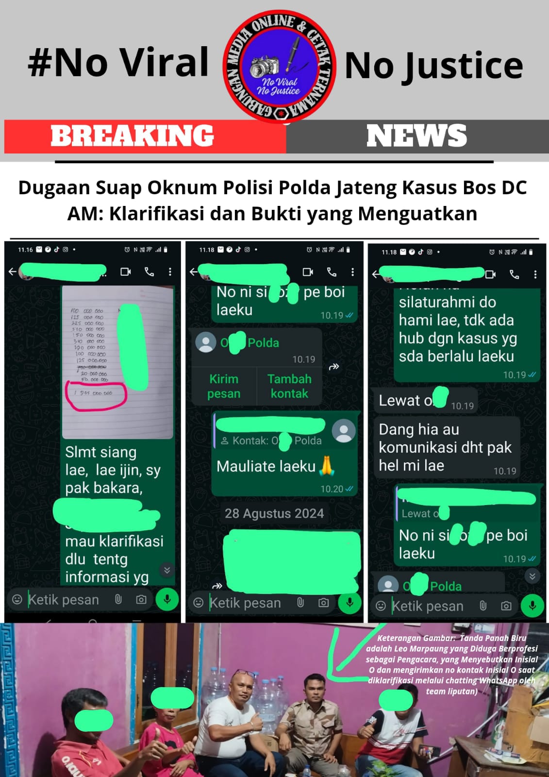Eksposelensa.com – JelahPerkara.com Semarang – Laporan dugaan suap terhadap oknum polisi di Polda Jawa Tengah terkait pembukaan blokir rekening bos DC, AM, terus bergulir. JelahPerkara.com telah berupaya melakukan klarifikasi kepada oknum polisi yang dimaksud, yang saat ini menjabat sebagai Kasatreskrim di Polres Magelang. Klarifikasi dilakukan melalui pesan WhatsApp, setelah inisial O tersebut disebutkan oleh pengacara Leo Marpaung.