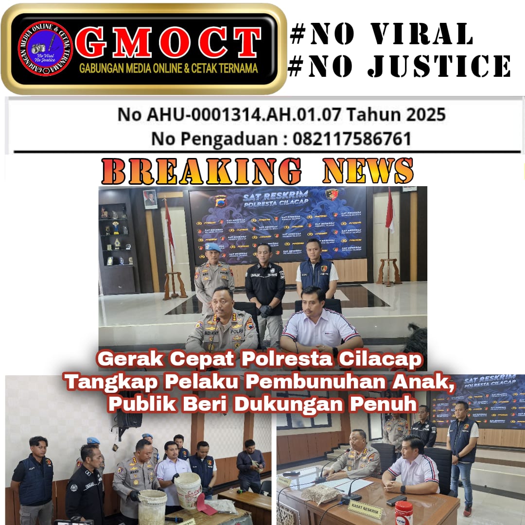 Eksposelensa.com – Cilacap, _ Agung Sulistio selaku Ketua Umum Gabungan Media Online dan Cetak Ternama (GMOCT) sekaligus Pemimpin Redaksi Sahabat Bhayangkara Indonesia (Kabarsbi.com) menyampaikan apresiasi tinggi kepada jajaran Satuan Reserse Kriminal Polresta Cilacap atas keberhasilan mengungkap kasus pembunuhan tragis terhadap seorang anak perempuan yang jasadnya ditemukan di dalam karung di Jalan Dr. Rajiman, Kelurahan Gunung Simping, Kabupaten Cilacap. Ia menilai langkah cepat aparat menjadi bukti nyata komitmen penegakan hukum yang tegas dan profesional.