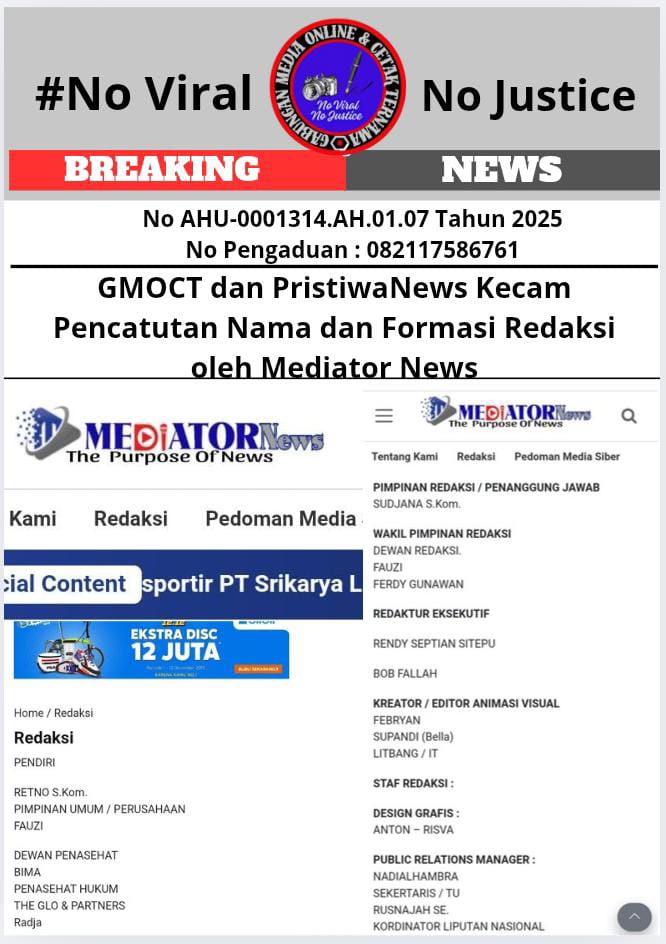 Eksposelensa.com – Jakarta (GMOCT) – Pimpinan Perusahaan Pristiwa News (Pristiwa TV Channel), Umar Fauzi, melontarkan kecaman keras terhadap media online Mediator News atas tindakan pencatutan nama dan formasi susunan redaksi yang persis sama dengan milik PristiwaNews. Kejadian ini terungkap pada Rabu (28/05/2025), setelah seorang rekan wartawan memberikan informasi mengenai kesamaan susunan redaksi kedua media tersebut.