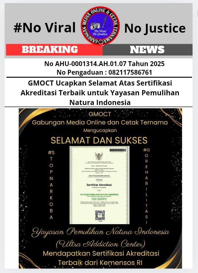 Eksposelensa.com – Kabupaten Semarang (GMOCT) Kamis 6 Oktober 2025 – Gabungan Media Online dan Cetak Ternama (GMOCT), sebagai mitra publikasi dan edukasi dari Yayasan Pemulihan Natura Indonesia Ultra Addiction Center, mengucapkan selamat atas diraihnya Sertifikasi Akreditasi Terbaik dari Kementerian Sosial Republik Indonesia (Kemensos RI) kepada yayasan tersebut.