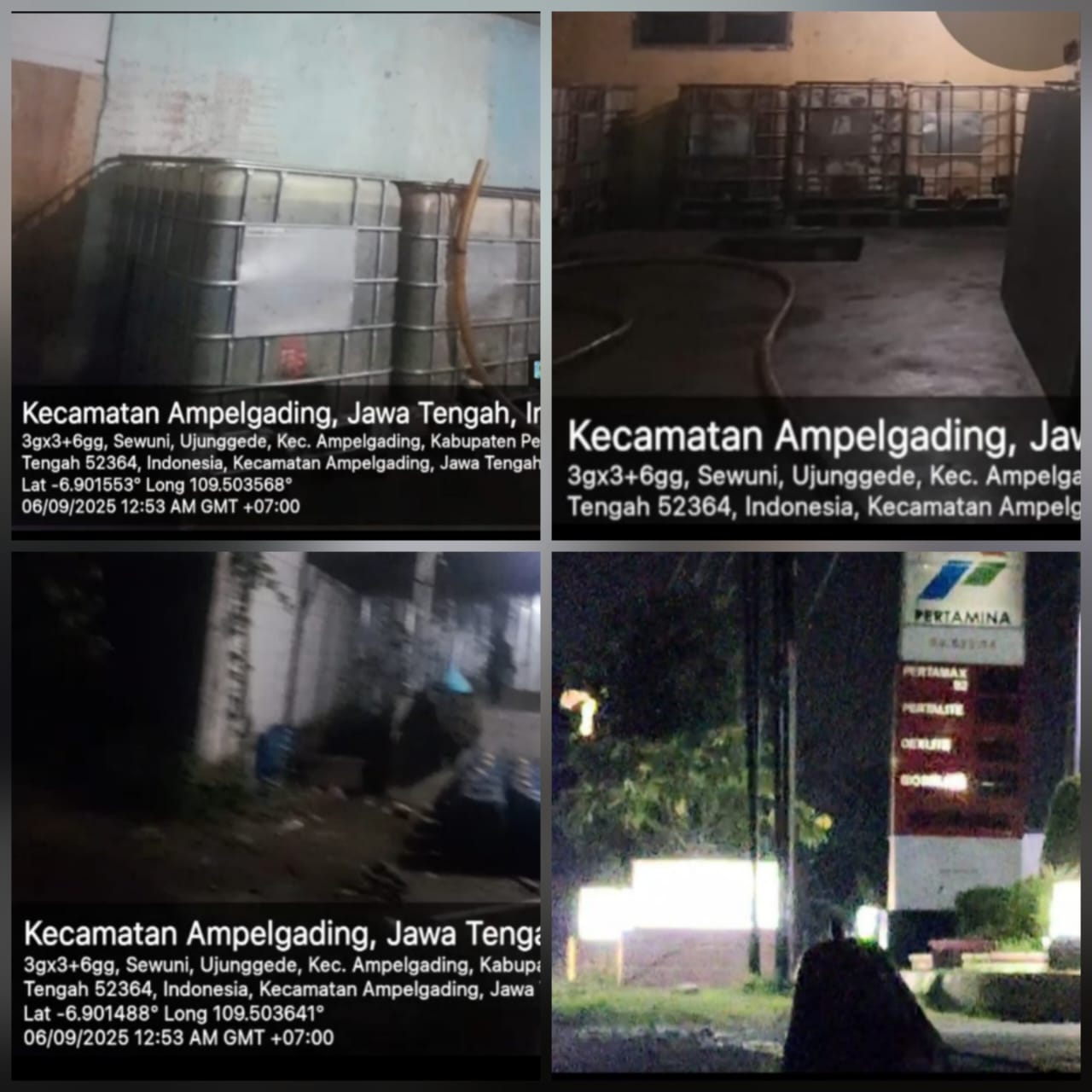 Eksposelensa.com – Pemalang- Ditemukan gudang penimbunan BBM solar subsidi di Sewuni Desa Ujunggede, Kecamatan Ampelgading, Kabupaten Pemalang, Jawa Tengah. Lokasinya tidak jauh dari Polsek Ampelgading, diduga kuat gudang solar ilegal hasil ngangsu dari SPBU 44.523.04 Comal Baru.