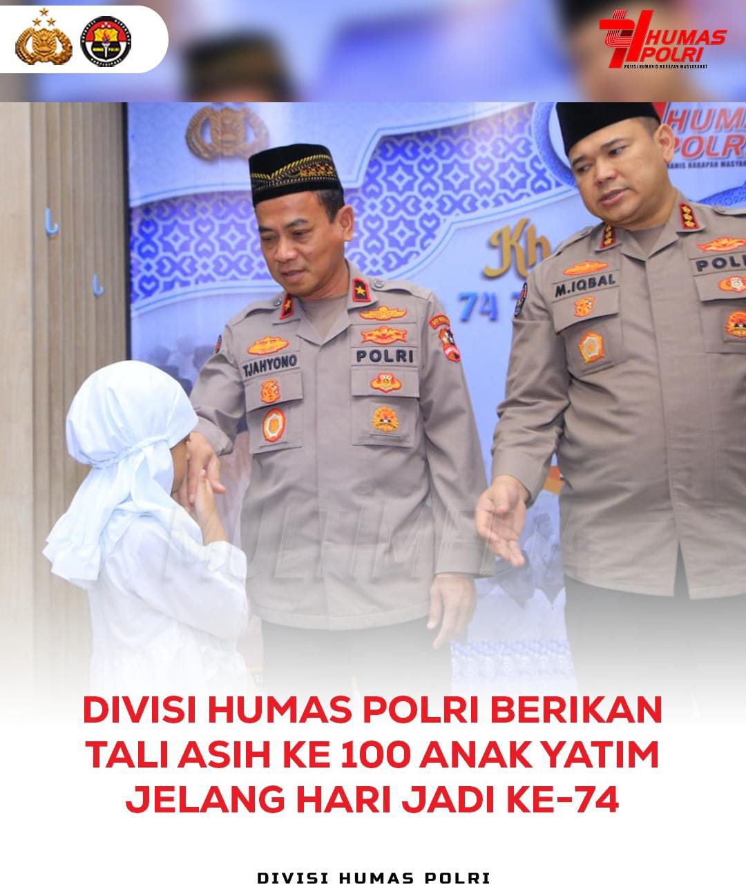 Eksposelensa.com Jakarta, — Dalam rangka memperingati Hari Jadi ke-74, Divisi Humas Polri menggelar kegiatan pemberian tali asih kepada 100 anak yatim sebagai wujud kepedulian dan rasa syukur. Kegiatan ini dilaksanakan usai acara Khataman Al-Qur’an yang diikuti oleh 74 tahfiz dari sejumlah pesantren bersama personel Divhumas Polri.