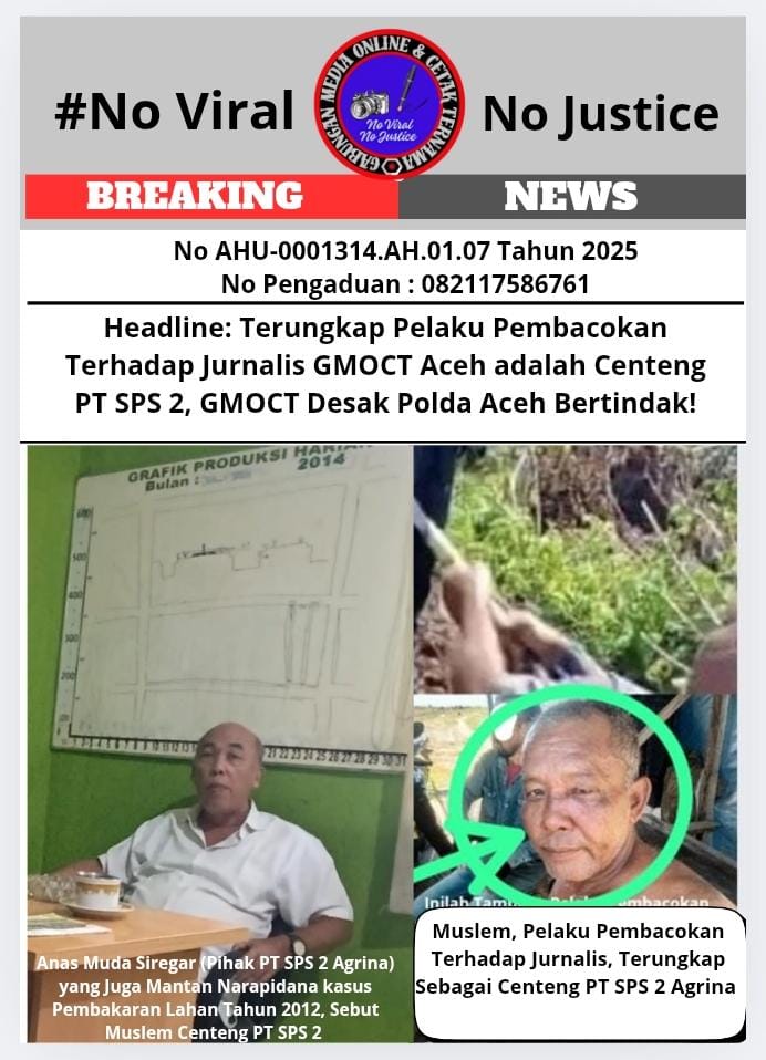 Eksposelensa.com – Nagan Raya, Aceh 10 Oktober 2025 (GMOCT) – Kasus pembacokan terhadap Ridwanto, Ketua DPD GMOCT Provinsi Aceh yang berprofesi sebagai jurnalis, memasuki babak baru. Fakta mengejutkan terungkap bahwa pelaku pembacokan, Muslem, adalah seorang centeng yang bekerja untuk PT SPS 2 Agrina.