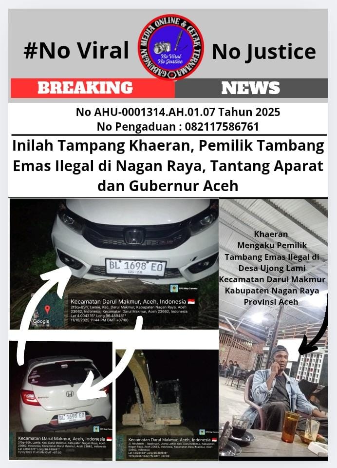 Eksposelensa.com – Nagan Raya (GMOCT) – Khaeran, seorang pemilik tambang emas ilegal di Desa Ujong Lami, Kecamatan Darul Makmur, Kabupaten Nagan Raya, menjadi sorotan setelah dengan berani menantang aparat kepolisian dan bahkan Gubernur Aceh terkait aktivitas penambangan ilegalnya. Hal ini terungkap saat tim liputan khusus dari Gabungan Media Online dan Cetak Ternama (GMOCT) mewawancarai Khaeran di sebuah kafe di Meulaboh.