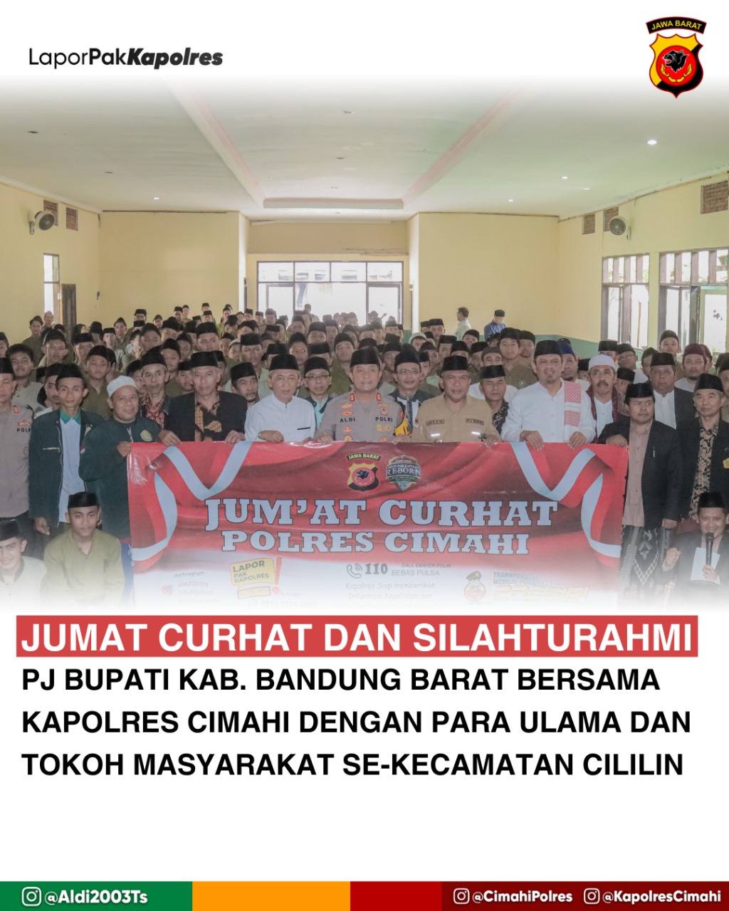 Kapolres Cimahi dalam sambutannya mengatakan bahwa jumat curhat merupakan sarana komunikasi polri dengan warga sehingga polri bisa mengetahui langsung keluhan masyarakat* dan bahwa kegiatan Silaturahmi ini sangat bermanfaat buat pondok pesantren khususnya dan buat masyarakat pada umumnya, karena pondok pesantren yang ada di wilayah Cililin dan KBB pada saat ini ada Bantuan yang namanya Beras Untuk Santri (BUS) Alhamdulilah pada saat ini Polres Cimahi bisa Turut andil dalam memberikan bantuan ini sebanyak 500kg Beras dan 1 Sumur Bor.