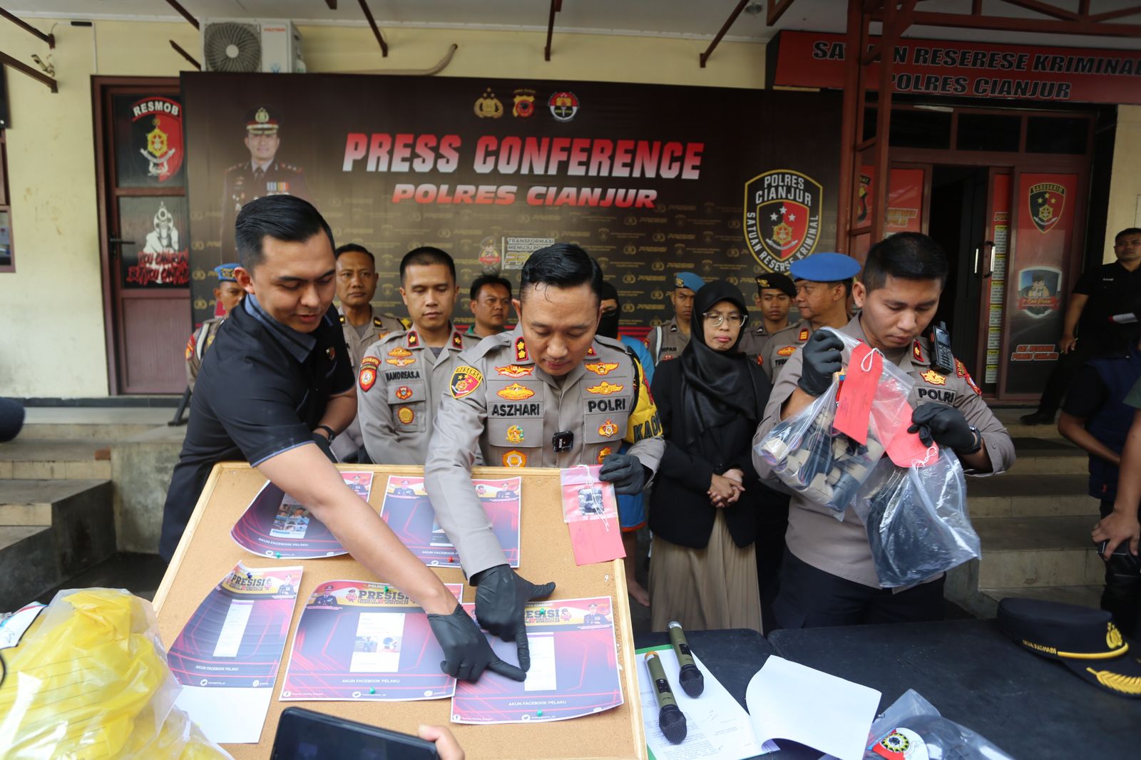 Eksposelensa.com | Kapolres Cianjur Polda Jabar AKBP Aszhari Kurniawan, S.H., S.I.K., M.Si. memimpin konferensi pers dugaan tindak pidana pembunuhan yang terjadi di wilayah hukum Polres Cianjur, Konfernsi pers tersebut digelar di depan Gedung Sat Reskrim Polres Cianjur Polda Jabar, Jumat (23/02/2024).