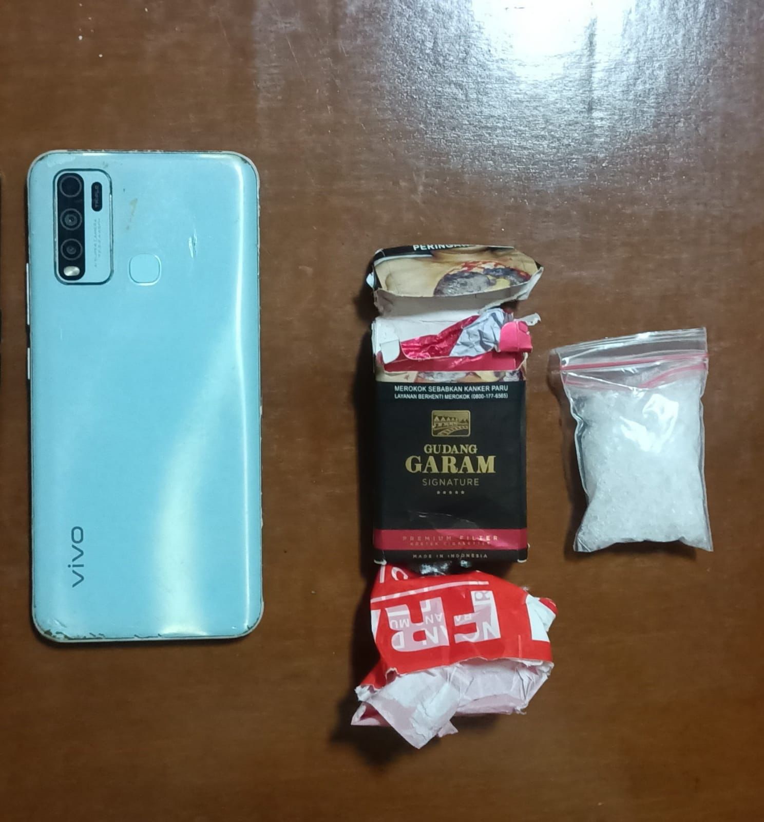 Dilanjutkannya, barang bukti yang berhasil diamankan 1 (satu) buah plastik klip bening yang berisi Narkotika jenis sabu, 1 (satu) buah bungkus rokok merk Gudang Garam Signature, 1 (satu) unit sepeda motor Yamaha Vixion warna hitam No. Pol : D 6645 UBQ, 1 (satu) unit handphone android merk VIVO warna biru muda berikut simcard.