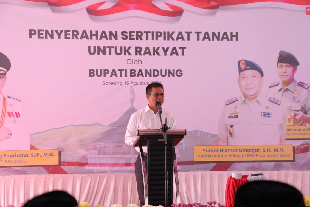 Bupati Bandung mengungkapkan bahwa Kepala Kantor Pertanahan Kabupaten Bandung hari ini melaksanakan penyerahan sertipikat tanah dan disaksikan Kepala Kantor Wilayah BPN Provinsi Jawa Barat dan Forkopimda Kabupaten Bandung.