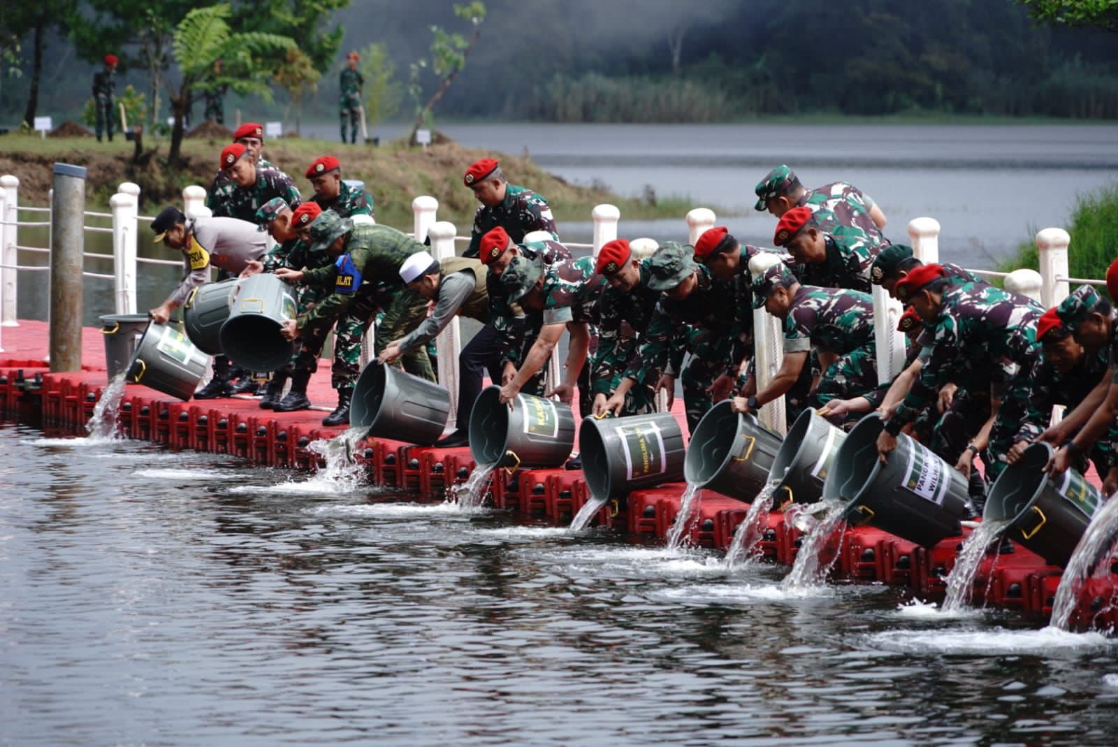 Bersama Panglima TNI, Bapak KASAD, Pj. Gubernur Jabar, Kapolda Jabar, Pangdam III Siliwangi dan PJU Mabes TNI serta sukarelawan dan komunitas dengan semangat dan berhati-hati melepas bibit ikan ke dalam air, dengan maksud memberikan mereka kesempatan untuk tumbuh dan berkembang biak.