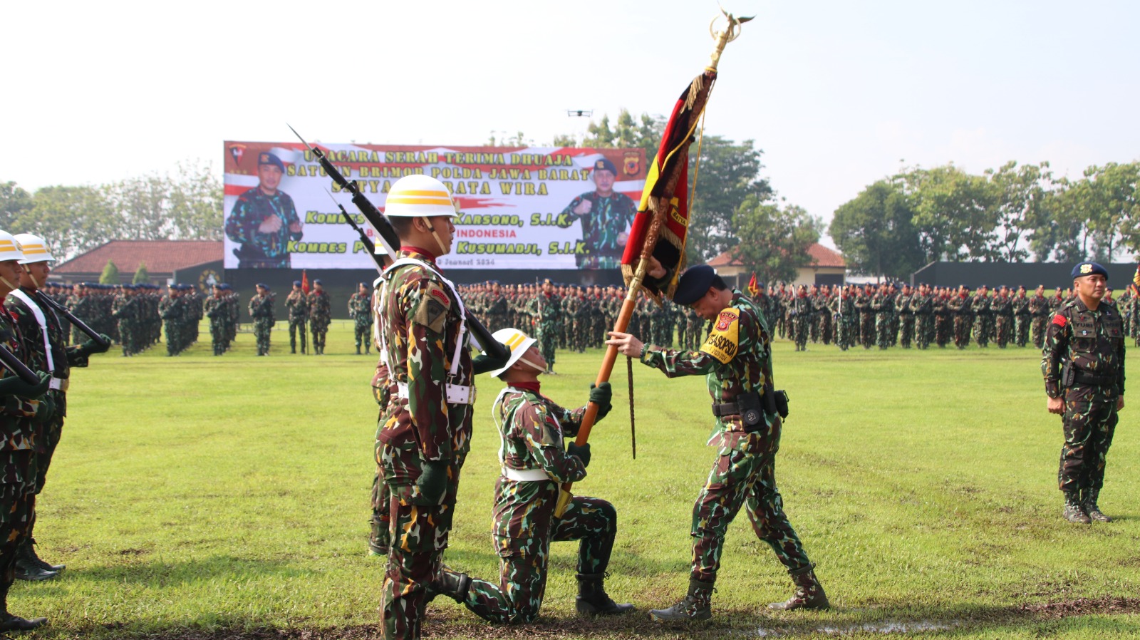 Upacara sertijab ditandai dengan penyerahan tongkat komando dan penyerahan Dhuaja Satbrimob Polda Jabar “Satya Bharata Wira”.