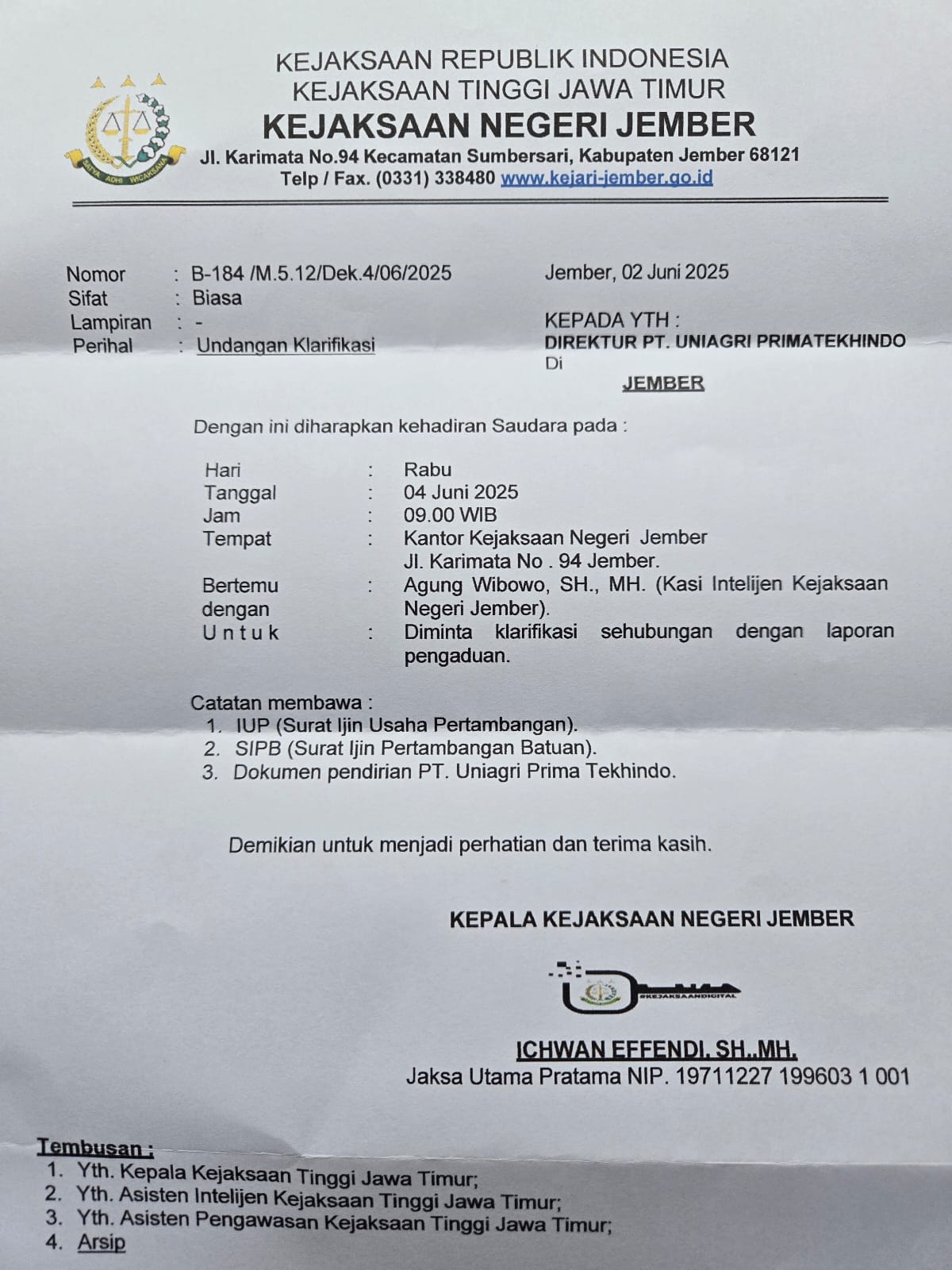 Eksposelensa.com – Jember – Polemik terkait aktivitas pertambangan galian C di Kabupaten Jember terus menuai sorotan publik. Baru-baru ini muncul surat undangan klarifikasi izin pertambangan dari aparat penegak hukum (APH) yang dilayangkan untuk PT.Uniagri Prima Tekhnindo untuk menindaklanjuti dugaan pelanggaran izin usaha. Menanggapi hal tersebut, Kabiro Sahabat Bhayangkara Indonesia (SBI) Jember, Gunawan, meminta aparat hukum bersikap transparan, netral, dan tidak berpihak pada kepentingan pihak tertentu.