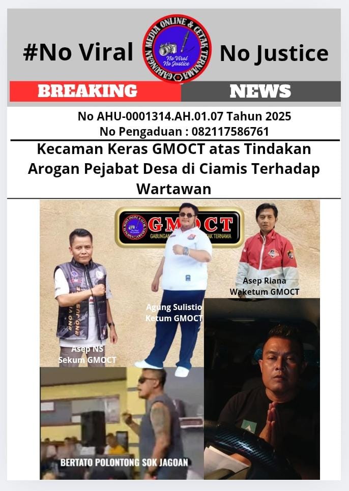 Ketua Umum GMOCT, Agung Sulistio, mengecam keras tindakan Kepala Desa Mekarmukti, Cisaga, Ciamis, Asep Ari, yang terekam menantang wartawan. Agung menilai sikap tersebut sebagai bentuk penghalangan kerja jurnalistik yang dapat dipidana sesuai Pasal 18 ayat (1) UU Pers. Ia meminta Polres Ciamis segera memproses kasus tersebut secara transparan.
