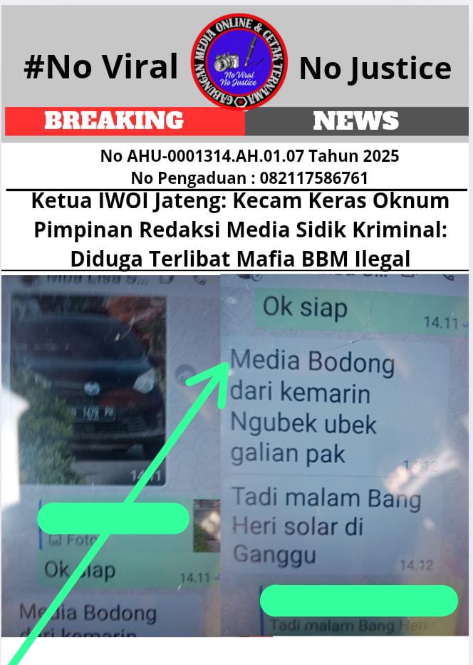 Eksposelensa.com – Semarang (GMOCT) – Ketua DPW Ikatan Wartawan Online Indonesia (IWOI) Jawa Tengah, Teguh, mengecam keras tindakan oknum Pimpinan Redaksi (Pimred) media Sidik Kriminal berinisial LA. LA diduga melakukan tindakan tidak beretika dengan memfoto mobil Teguh dan menyebarkannya ke beberapa bos BBM ilegal dan area tambang di Pemalang dan sekitarnya. Informasi ini juga telah diterima oleh GMOCT (Gabungan Media Online dan Cetak Ternama).