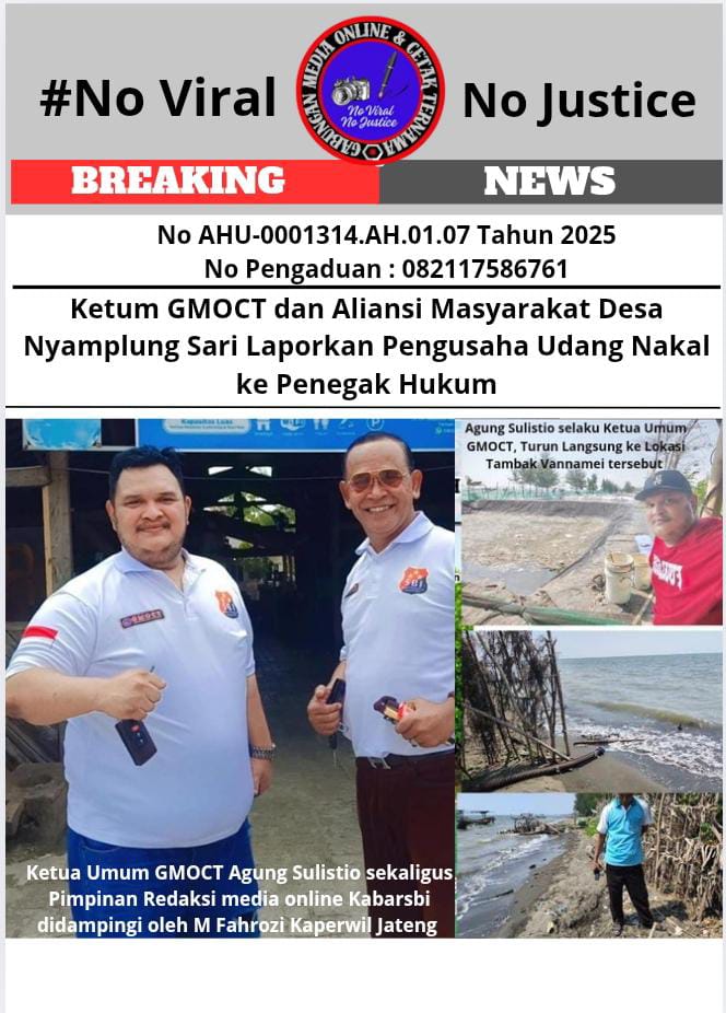 Eksposelensa.com – Pemalang, Jawa Tengah (GMOCT) – Gabungan Media Online dan Cetak Ternama (GMOCT), yang mendapatkan informasi dari media online Kabarsbi (anggota GMOCT), akan berkolaborasi dengan aliansi masyarakat Desa Nyamplung Sari untuk melaporkan pengusaha udang vaname ke pihak berwajib. Laporan ini terkait dugaan pelanggaran hukum dan kerugian yang dialami masyarakat akibat aktivitas tambak udang yang diduga tidak memiliki izin dan mencemari lingkungan.