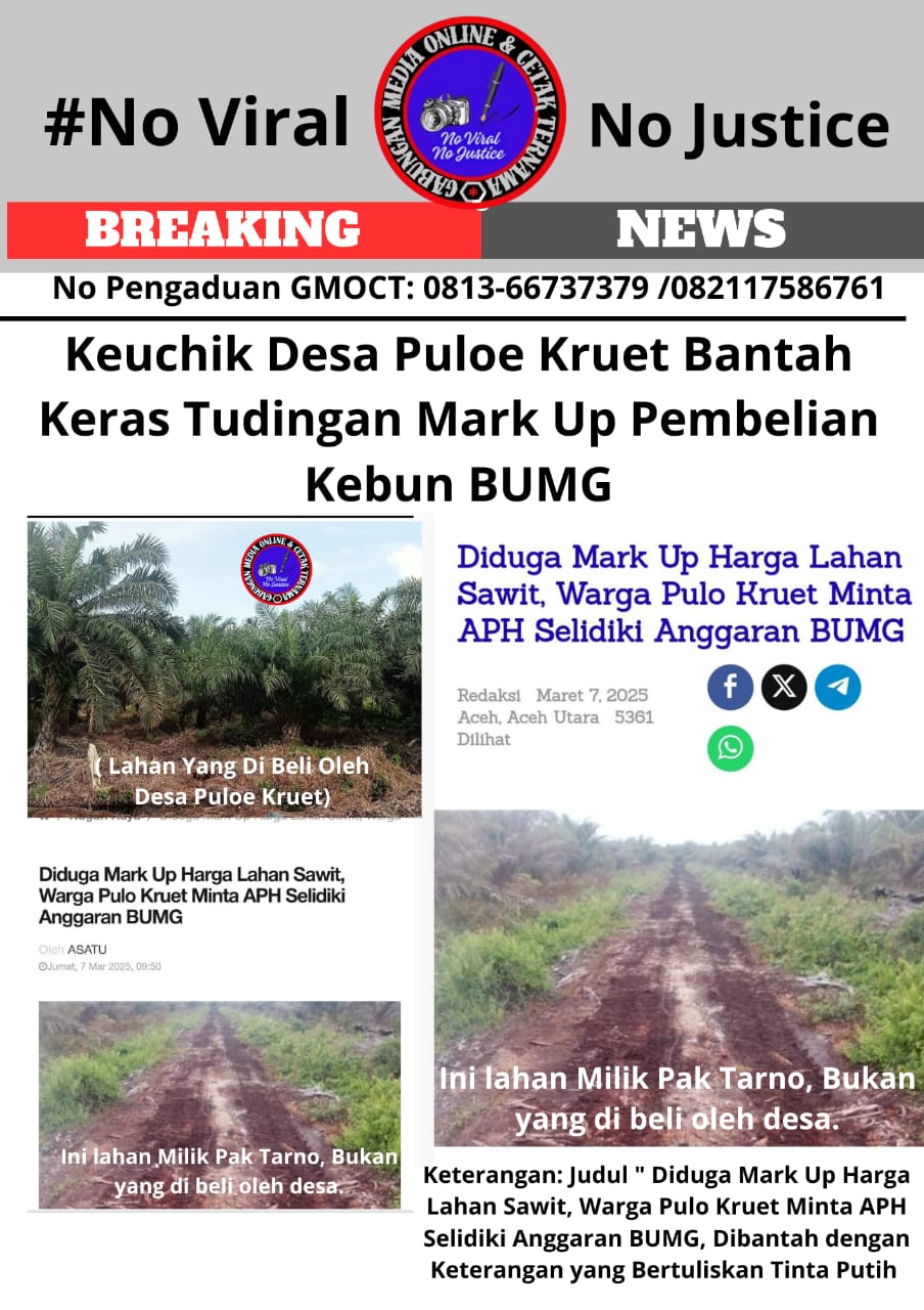 Eksposelensa.com – Puloe Kruet, Aceh, Sabtu 8 Maret 2025 – Pemberitaan beberapa media online terkait dugaan mark-up harga pembelian kebun untuk Badan Usaha Milik Gampong (BUMG) Desa Puloe Kruet mendapat bantahan keras dari Keuchik Hendra Sulaiman dan Ketua BUMG Abdul Rafa. Informasi awal yang diperoleh GMOCT dari media online Bongkarperkara (anggota GMOCT) menyebutkan adanya tudingan mark-up dan proses pembelian yang tidak sesuai musyawarah. Tudingan tersebut diduga dilontarkan oleh warga desa yang pernah mencalonkan diri sebagai kepala desa.