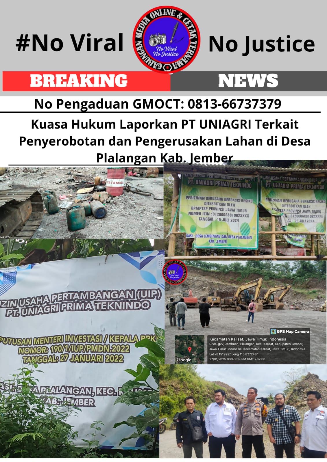 Eksposelensa.com – Jember, Jawa Timur – Aktivitas tambang galian C PT UNIAGRI di Desa Plalangan, Kecamatan Kalisat, Kabupaten Jember, berbuntut panjang. Kuasa hukum pemilik lahan, Agung Sulistio, dan Bambang L A Hutapea, SH.MH.C.Med, menyatakan akan melaporkan perusahaan tersebut atas dugaan penyerobotan dan pengerusakan lahan. Langkah hukum ini diambil setelah penutupan aktivitas tambang yang dilakukan oleh Kapolsek Kalisat dan Kepala Desa Plalangan, serta disaksikan langsung oleh kuasa hukum.