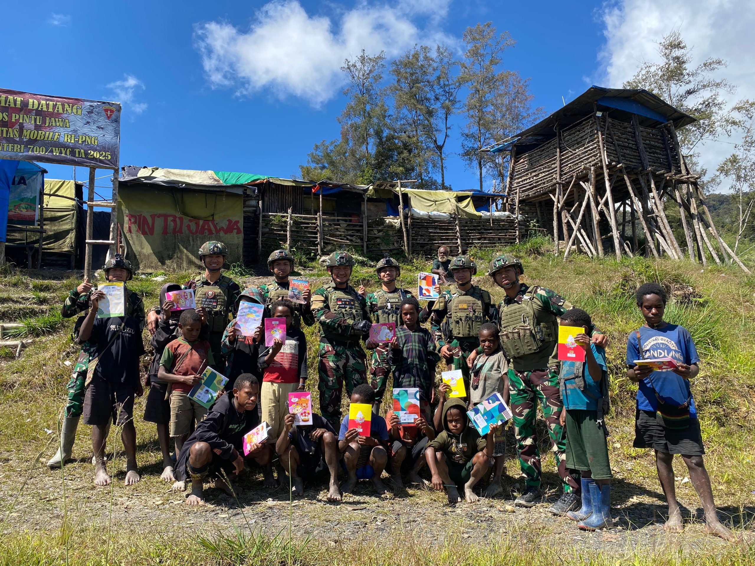 Anak-anak Kampung Wombru, dengan mata berbinar dan senyum malu-malu, menyambut kehadiran para prajurit layaknya sahabat lama. Di tangan-tangan kecil itu, buku bergambar dan pulpen warna-warni menjadi simbol cinta yang dikirimkan dari hati ke hati.