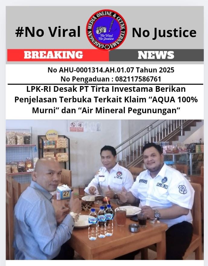 LPK-RI Desak PT Tirta Investama Berikan Penjelasan Terbuka Terkait Klaim “AQUA 100% Murni” dan “Air Mineral Pegunungan”