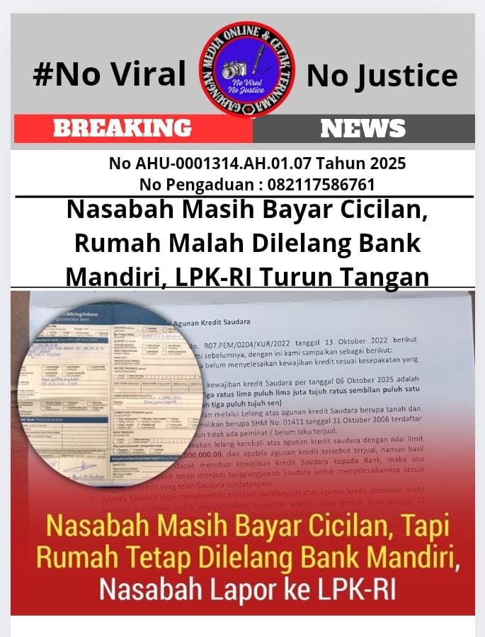 Eksposelensa.com – PEMALANG (GMOCT) 1 November 2025 – Seorang nasabah Bank Mandiri Cabang Pemalang mengadukan nasibnya ke Lembaga Perlindungan Konsumen Republik Indonesia (LPK-RI) setelah menerima surat pemberitahuan lelang rumah dari pihak bank. Ironisnya, nasabah tersebut mengaku rutin membayar cicilan kredit sebesar Rp1 juta setiap bulan selama 17 bulan terakhir. Informasi ini diperoleh Gabungan Media Online dan Cetak Ternama (GMOCT) dari media online Kabarsbi yang tergabung di dalamnya, pada 1 November 2025 pukul 08:00 WIB.
