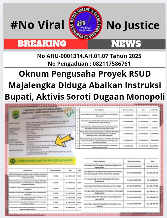 Eksposelensa.com – Majalengka (GMOCT) 23 Agustus 2025 – Aktivis anti korupsi dan pemerhati sosial, Saeful Yunus, SE.MM, menyoroti dugaan pelanggaran dalam pelaksanaan proyek pembangunan Rumah Sakit Umum Daerah (RSUD) Majalengka. Menurutnya, oknum pengusaha yang mengerjakan proyek tersebut diduga tidak menjalankan kewajiban sesuai amanat Undang-undang, berpotensi menimbulkan kerugian keuangan negara.