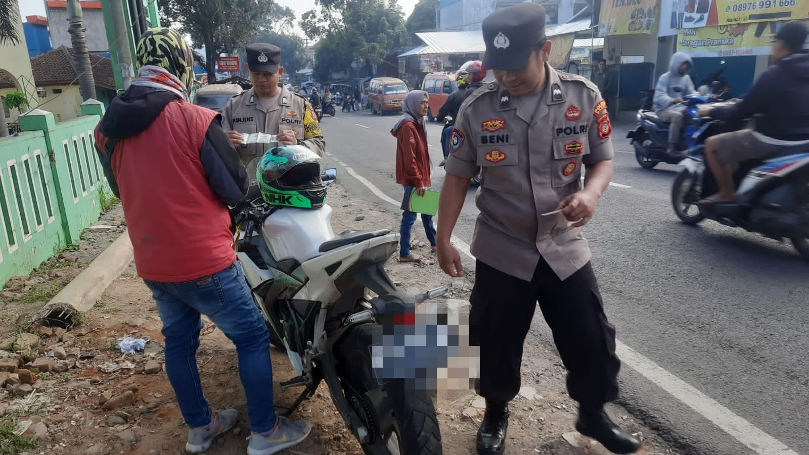 Selain itu juga di lakukan pemeriksaan terhadap 3 kendaraan R2 yang tidak di lengkapi dengan surat surat dan memberikan teguran kepada 12 pelanggar.