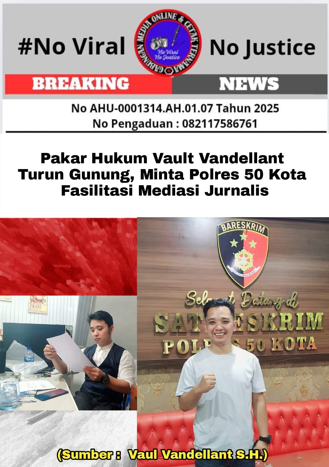Eksposelensa.com – Payakumbuh – Pakar hukum Vault Vandellant S.H., turun gunung menanggapi serius insiden pencemaran nama baik yang menimpa sejumlah jurnalis, yakni RYN, RK, ARL, EY, dan AS. Ia meminta agar Polres 50 Kota dapat memfasilitasi mediasi antara pihak-pihak terkait.