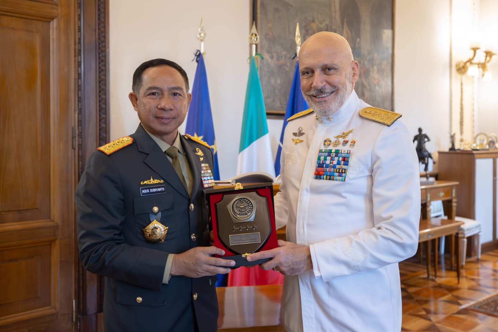 Ekposlensa.Com ||Panglima TNI Jenderal TNI Agus Subiyanto melaksanakan kunjungan ke Italia dalam rangka pertemuan bilateral dengan Kepala Staf Pertahanan Italia (Chief of Defence Staff) Admiral Giuseppe Cavo Dragone Kepala Staf Pertahanan, di Markas Besar Angkatan Bersenjata Italia, Senin (24/6/2024)