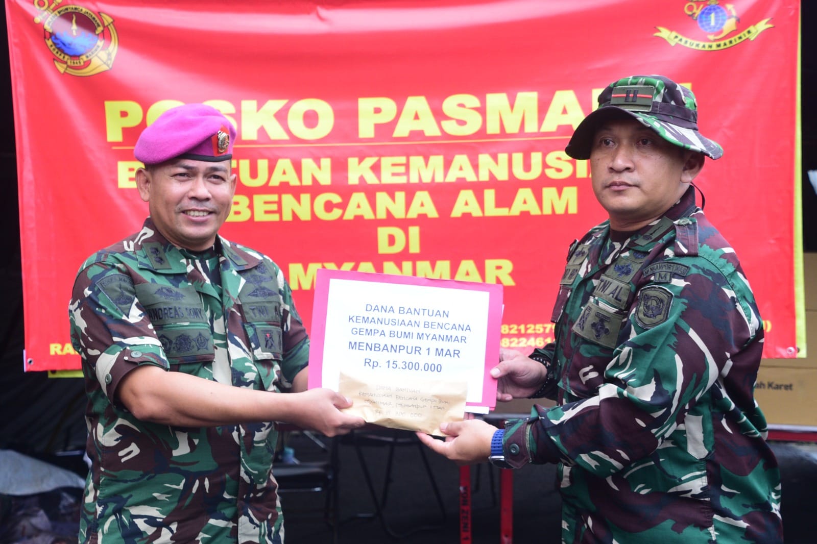 Tak lama usai posko didirikan, beberapa Satuan di bawah jajaran Pasmar 1 langsung mengirimkan beberapa bantuan diantaranya masker, selimut dan uang tunai yang diterima oleh personel yang sedang siaga di posko bantuan.