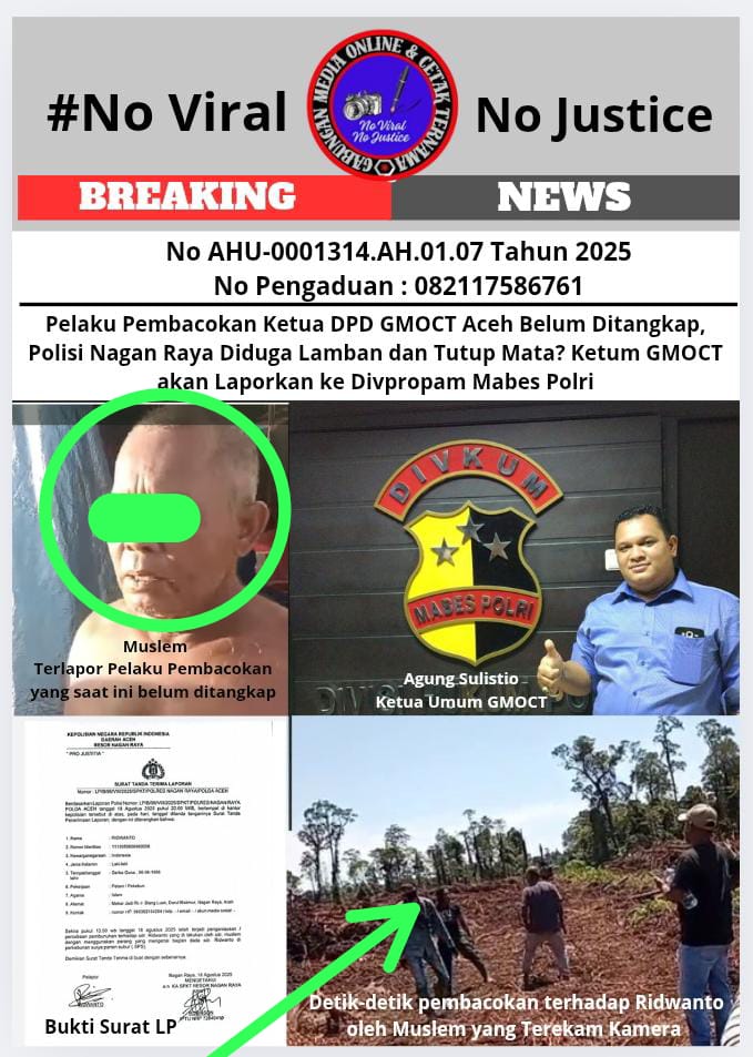 Eksposelensa.com – Nagan Raya (GMOCT) 20 Agustus 2025 – Kasus pembacokan terhadap Ketua DPD GMOCT Provinsi Aceh, Ridwanto, hingga kini belum menemui titik terang, memicu dugaan adanya permainan kotor dalam penegakan hukum di Kabupaten Nagan Raya. Laporan resmi telah dibuat ke Polres Nagan Raya, namun pelaku yang identitasnya disebut-sebut sudah diketahui, masih bebas berkeliaran.
