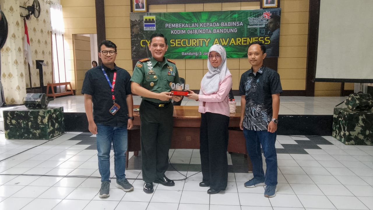 Dandim 0618/Kota Bandung Kolonel Infanteri Donny I Bainuri S,Hub,Int,M.A.S.S.S.,mengatakan “hari ini Kodim Kota Bandung bekerjasama dengan tim cyber dari Telkom melaksanakan kegiatan pembekalan cyber security awardness kepada seluruh personil Kodim Kota Bandung utamanya kepada para Babinsa dan juga anggota yang ada di staf.