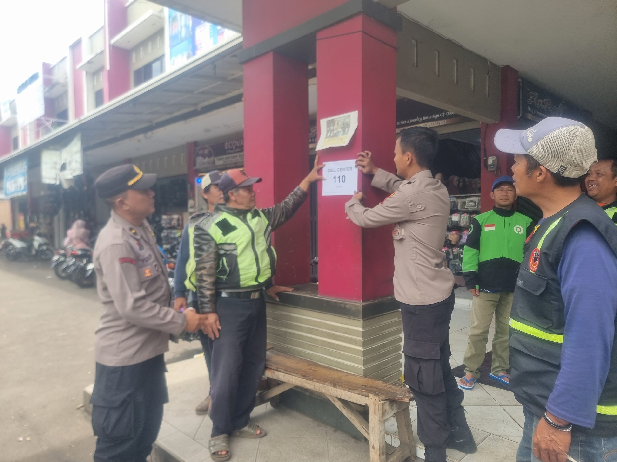Eksposelensa.com – Majalengka – Panit Samapta II Polsek Cikijing Polres Majalengka Polda Jabar IPDA D. Yusuf, S.Sos., M.Si., bersama Bhabinkamtibmas Bripka Achmad Supriyono melakukan penempelan pamflet sarana pengaduan call centre 110 di Pasar Cikijing, Sabtu (29/11/2025).