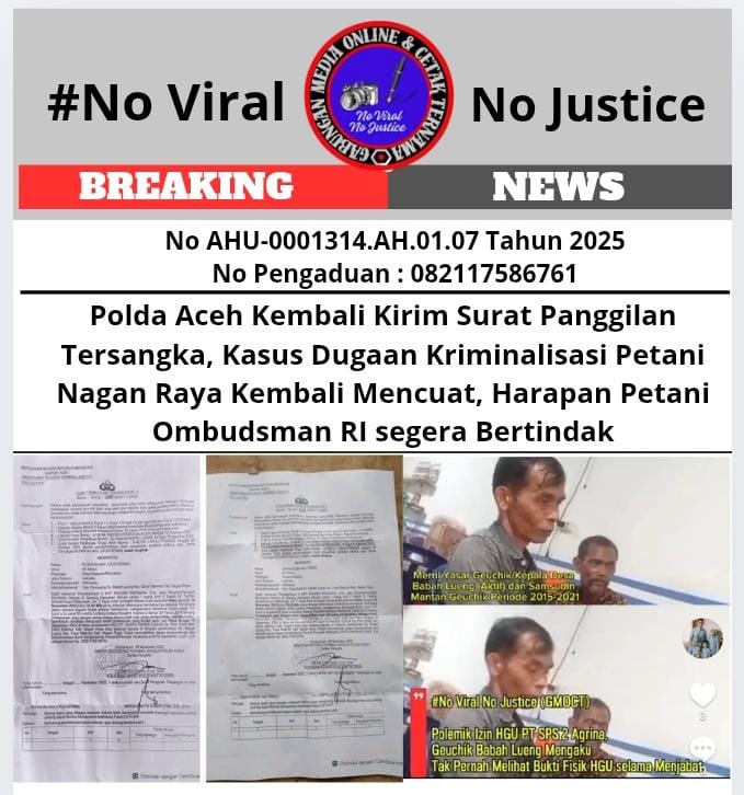 Polda Aceh Kembali Kirim Surat Panggilan Tersangka, Kasus Dugaan Kriminalisasi Petani Nagan Raya Kembali Mencuat, Harapan Petani Ombudsman RI segera Bertindak