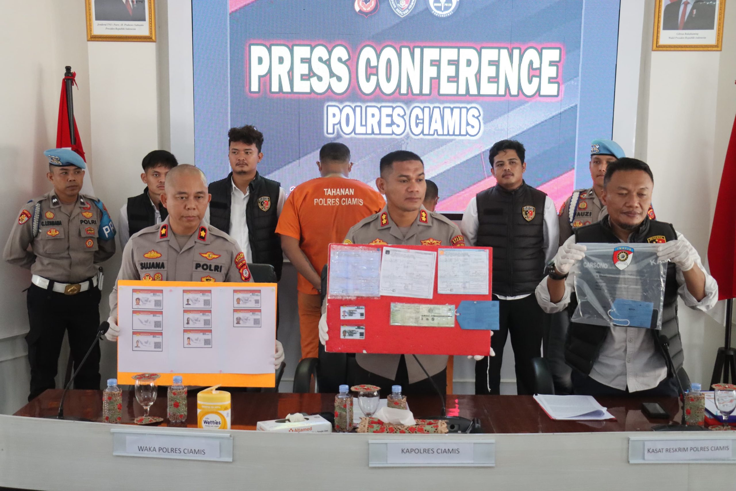 Eksposelensa.com – Polres Ciamis kembali menunjukkan komitmennya dalam menegakkan hukum dan menjaga ketertiban masyarakat. Melalui kegiatan konferensi pers yang digelar pada Senin (26/5/2025), Kapolres Ciamis AKBP Akmal, S.H., S.I.K., M.H. didampingi oleh Wakapolres Kompol Sujana, S.Pd., dan Kasat Reskrim AKP Carsono, S.H. mengumumkan keberhasilan pengungkapan kasus tindak pidana pemalsuan surat, khususnya pembuatan dan penggunaan SIM B II Umum palsu.